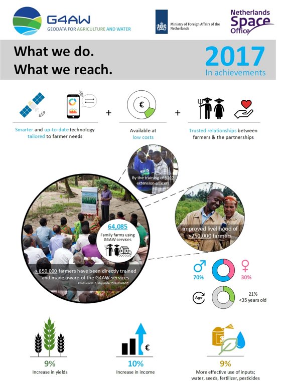 Geodata for Agriculture and Water (G4AW) improves food security in developing countries by using satellite data. Netherlands Space Office (NSO) is executing this programme, commissioned by the Dutch Ministry of Foreign Affairs. The Dutch government and the Netherlands Space Office share the vision that access to information is key to increasing the livelihood of the poorest citizens of Planet Earth. We therefore support the development of satellite-based information services to sustainably improve food security and thereby partake in the contribution to the Sustainable Development Goals.