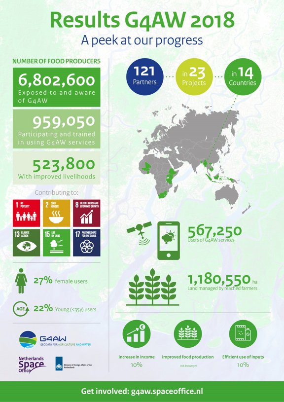 G4AW wordt ondersteund door het Nederlandse ministerie van Buitenlandse Zaken en heeft als doel de klimaatbestendigheid van agrarische productiesystemen in Afrika en Azië te vergroten met behulp van satellietgegevens. Het programma begon in de periode 2015-2018 met 23 zelfstandige projecten die bijdragen aan de G4AW-doelstellingen. In Mali en Oeganda werden bijvoorbeeld 122.849 op satellieten gebaseerde indexverzekeringen uitgegeven. In Bangladesh werden 44.418 abonnementen op adviesabonnementen verstrekt aan voedselproducenten. In totaal maakten 395.135 mensen efficiënter gebruik van water, kunstmest en pesticiden. In Burkina Faso werd het levensonderhoud van meer dan 39.000 mensen verbeterd. In 2017 maakten 64.085 voedselproducenten gebruik van de G4AW-diensten en werden de bestaansmiddelen van 250.000 huishoudens verbeterd. In 2018 nam dit toe tot 567.250 gebruikers en verbeteringen van het levensonderhoud van 523.800 voedselproducenten.